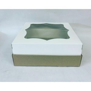BANDEJA DE CARTON CON MANIJAS 25x25x12 CM Y TAPA BLANCA CON VISOR